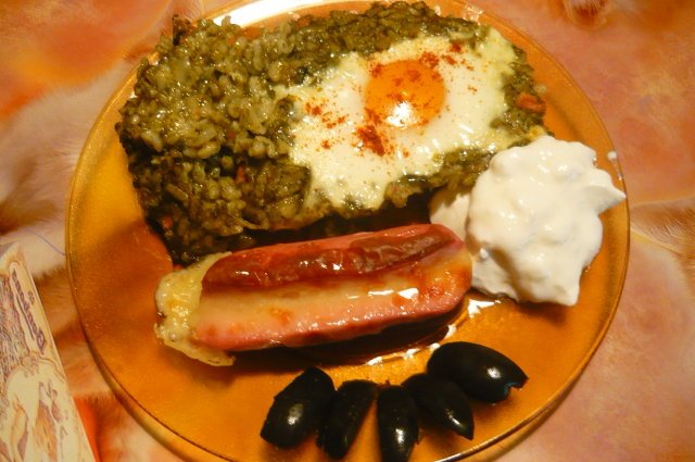 Ориз със спанак и яйца и кренвирш с кашкавал