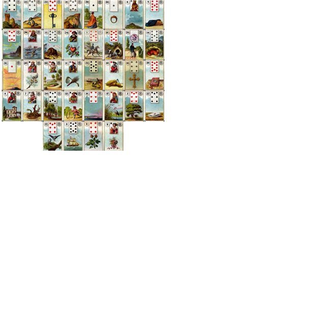 2 (детелина) лилии (30), букет (9), риби (34), змия (7) допълнителни карти са котва, писмо, дом, ключ, сърце, кораб ....