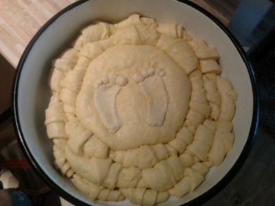 Бобо ще става фармацевт взе шишенце с Упсарин  Mr. Green.Благодаря на Tasha и anelisa за рецептата за погачата,пускам снимка в сурово състояние,защото по-хубаво се очертават стъпалцата  Grinning ,а и на финала малко я поизпуснах отгоре,ама пък мнооого вкусна стана  Blush