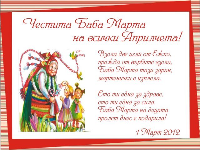 Честита Баба Марта и от нас.Бъдете бели и червени,румени засмени и много,много здрави.