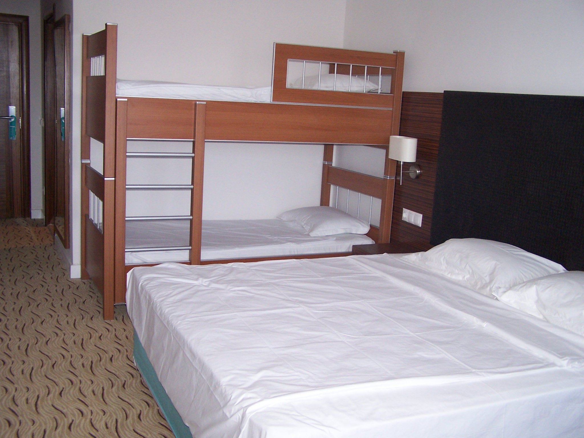 Относно двуетажните легла - преценете. Снимката е от Палм уингс бийч ризорт в Кушадасъ, но леглата бяха 1:1, а и едва ли са по-различни сега.