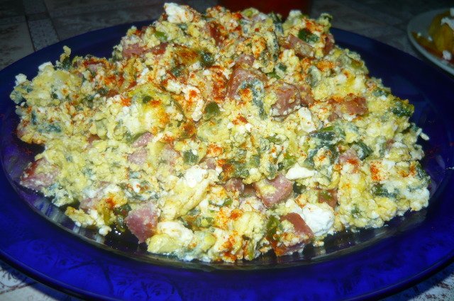 Бъркани яйца със пресен лук,шпек салам и сирене [/i