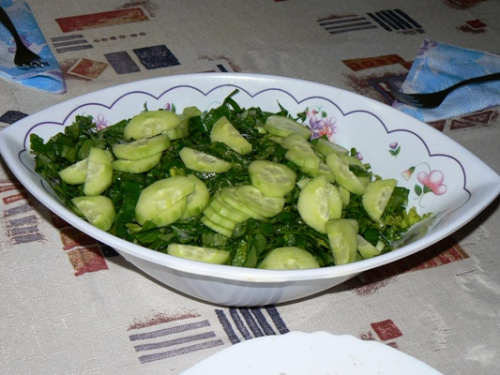 От мен: салата с моцарела, чери домати, босилек и пресен лук, пилешки бутчета с панировка на фурна (обезкостени и с отстранена кожа) и чеснов сос.