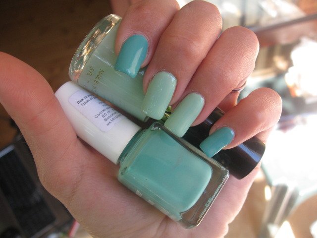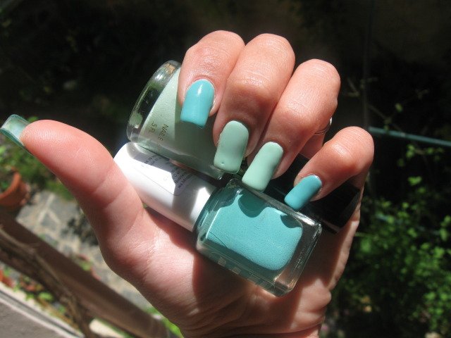 Вече 5 дни съм така - Revlon Minted и Gabrini summer M107. Ревлона не ми балоняса както повечето се оплаквате и много ми харесаха и двата. Днес се изтрих, защото вече ми писна иначе никъде не са мръднали.