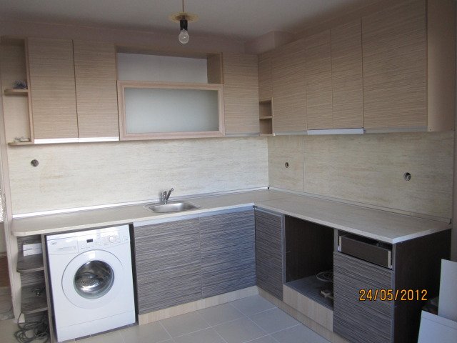 Кухнята е с дължина 2.40 м,  на долния ред трябва да се сложат пералня и печка -не са за вграждане. Горният ред са стандартни шкафове с горно отваряне.  Ще има и допълнителен шкаф с размери 2,20x64x34, който ще  бъде разделен на три или четири вратички.  Материалът е МДФ  - бяло/не гланц/. Плот и и гръб - също МДФ. Офертата, която имам като цена е 1300 лв.