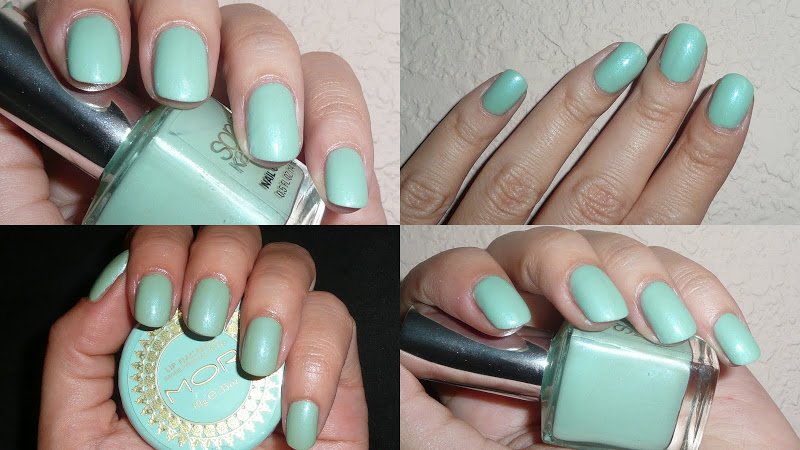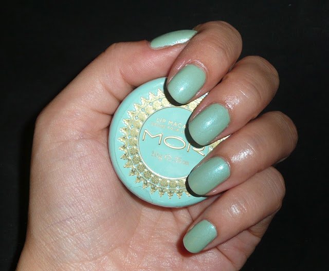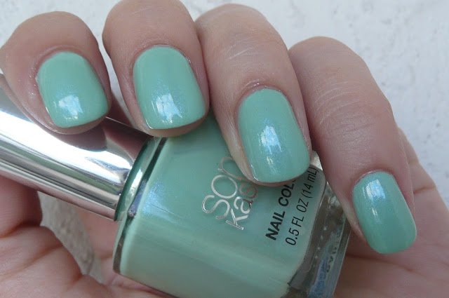 Направих грешката да се лакирам на терасата в 30-градусовата, влажна жега и лакът ми стана на брутални балони. Сложих му от популярния напоследък топ Hong Kong Girl и ги елиминира напълно. На снимките не си личи, но всъщност шимърът е син, а не зелен. Това ми е първата и единствена мента в колекцията (защо му казват ментов на този цвят ми е непонятно, нищо общо с разстението.)