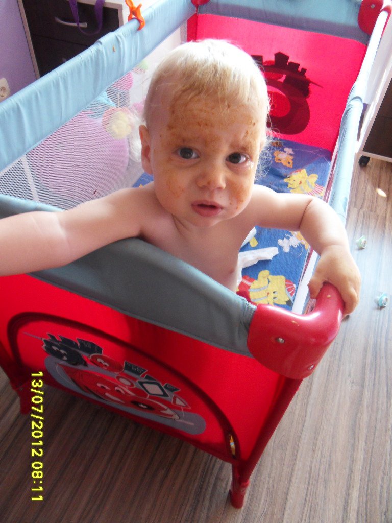Вики е сладур голям! Ама не и на втората снимка ..... Wink Как ли сте се спасили от миризмата, направо не знам Simple Smile И Марио веднъж си свали наакания памперс, ама го хвърли на земята от кошарката; добре, че не се е запознал с него отблизо, като Вики  Joy