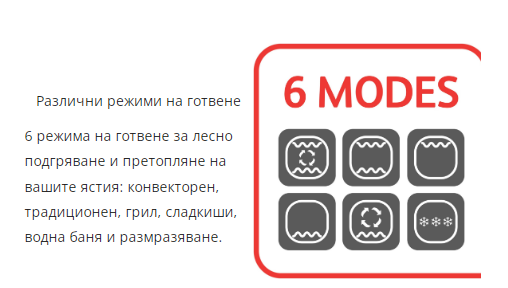 Вътрешни размери (ДхШхВ): 35.5 х 28 х 26 см; • 3 нива на печене