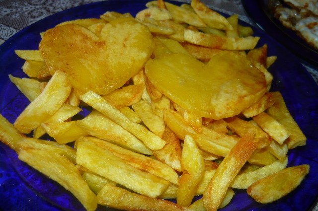 ; пържени картофи( сърчицата са се получили от картоф които имаше същата форма и съм го рязала на дължина )