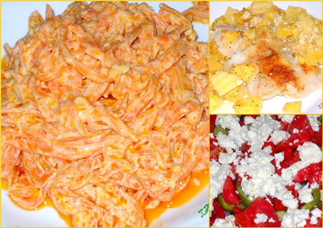 У нас тия дни пълно тиквичково меню - крем-супа от тиквички с къри, не знам за кой път  омлети ветрилца от тиквички, и за трети път Embarassed баница с тиквички. Другото е риба на фурна по английски, не знам какво е английското, но се получава много вкусно нещо. Пробвана е и със сметана за готвене и  със заквасена, все е вкусотия. Heart Eyes Много вкусна салатка от моркови и домашен лимонов сладолед.