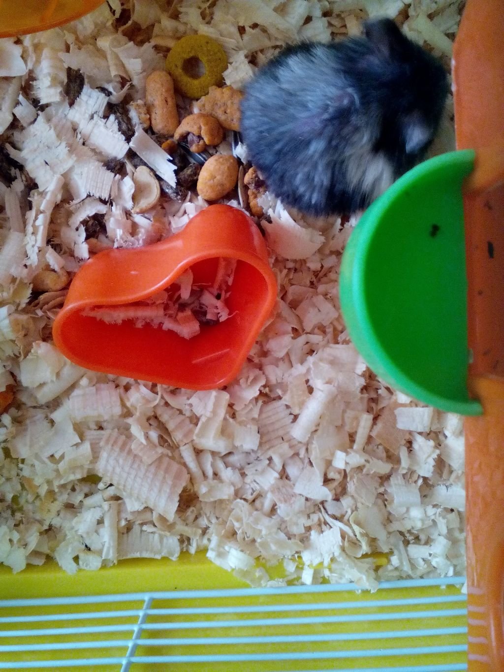 безкрайно ми е сърдита, защото аб горчи и все още не е свикнала с новата клетка - преместих я в тази на мишката, която почина в неделя, защото е доста по-голяма; клетката на Лора беше за птици, бях я направила триетажна с плоскости, люлка и стълбички, но не беше достатъчно широка