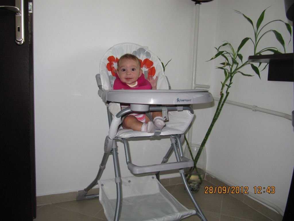 Ние нито лазим, нито пълзим... Само ритаме с крака като подивели. Обръща се по корем, вдига главата и след малко почва да крещи понеже не знае какво да прави. Вчера дадох за първи път каша - започнах с млечна бананова, щотото сме голям фен на бананите. Вчера 1с.л., днес 2 с.л.... и голям сън - от 11 до 12:30 - навън, сред виковете на децата.... Мойто май от глад се е будело...