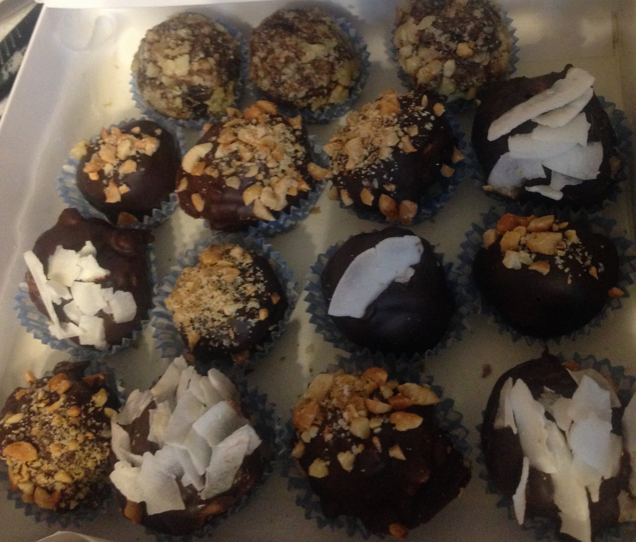 Едни лесни бонбони от фъстъчено масло и кокосово брашно+подсладител по желание и обляни в разтопен черен шоколад.
