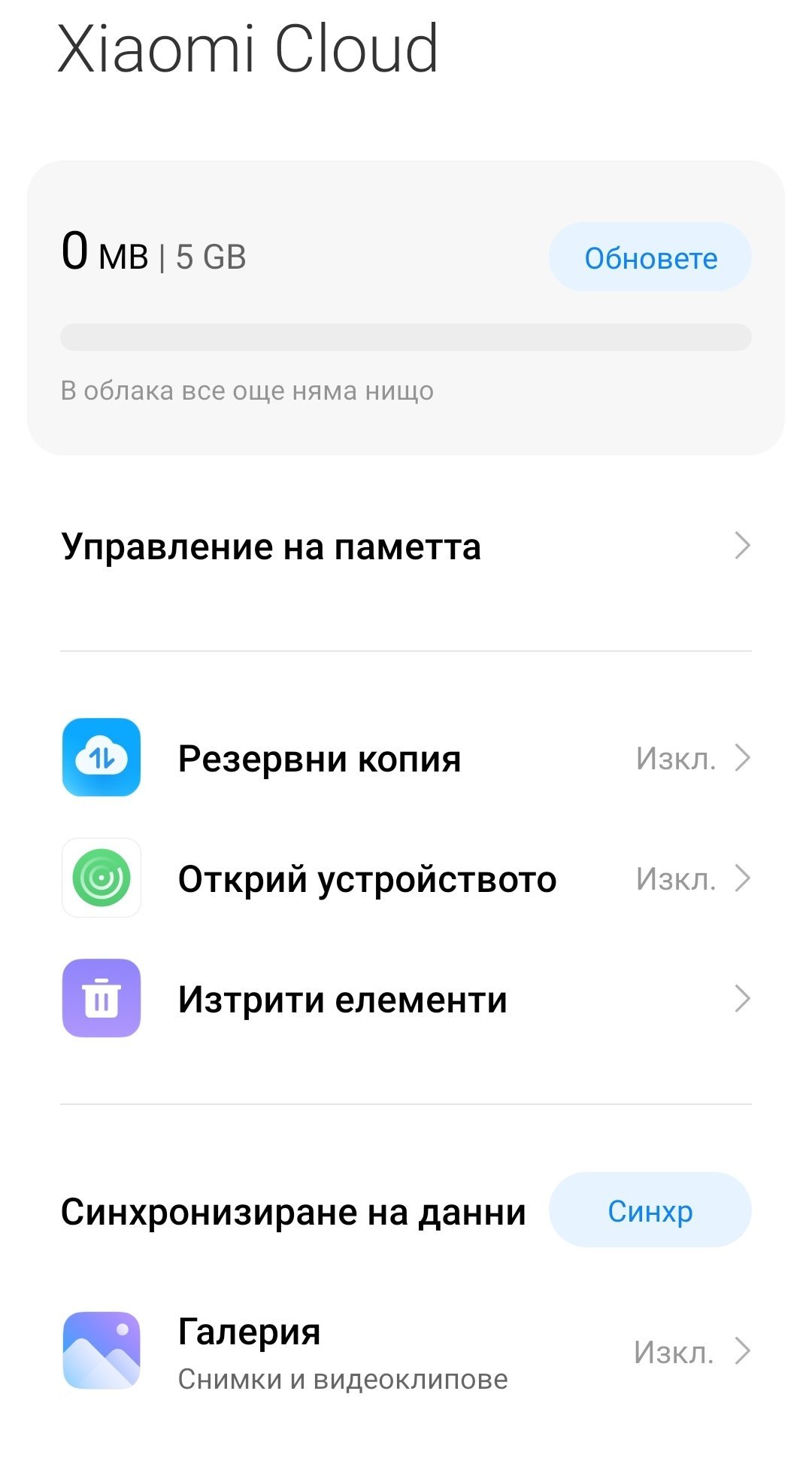 1. Означава, че не са качени в хранилището на Xiaomi. В Настройки > Mi Профил > Xiaomi Cloud можеш да видиш какво е качено, какво се синхронизира и какво не. При мен нищо не е качено и опцията е изключена за всичко.