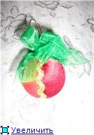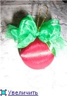 Питах сутринта за коледните топки на колко делите топката, на 2 или на 4 и понеже не получих отговор , реших да се пробвам да направя играчката в две части (На 1-ва стр. има линк към сайта на сисак и там е показана на 4 части). Уших една снежинка със златно ламе върху червена панама, а за гръбче ползвах червен сатенен плат, златен ширит отстрани и зелена панделка за отгоре, за да не е само в червено. Ето и снимки от всички страни:
