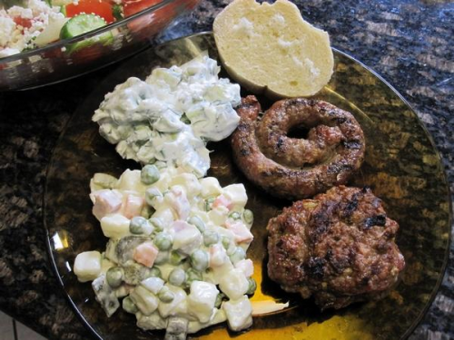 Кюфтета и наденички със салати