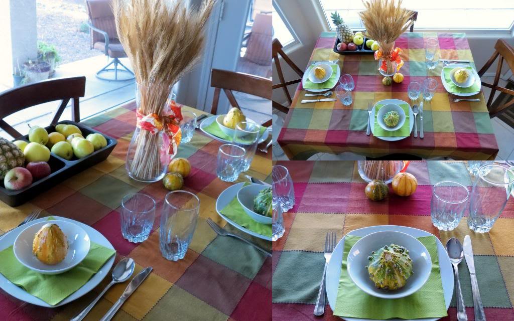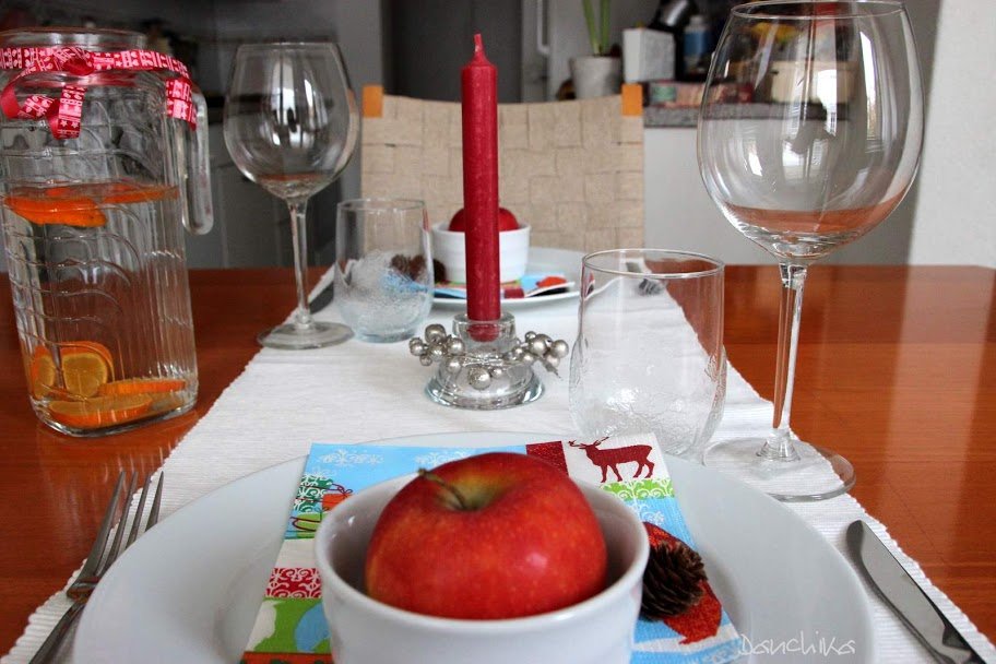 от мен една скромна маса /бях ви споменала преди, че очаквам гости/. мина доста добре. имах повече идеи за декорация, но уви, не успях да ги осъществя. много липсват свещите и шишарките тук, но.... друго път.