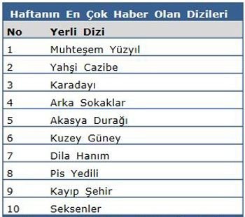 MTM bu hafta da tercih edilen diziler araştırmasının yanı sıra haftanın habere en çok konu olan yerli dizilerini de araştırdı. Araştırmaya göre, Muhteşem Yüzyıl uzun bir süredir olduğu gibi yine en çok konuşulan yerli dizi olarak zirveye yerleşmeyi başardı