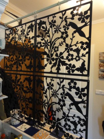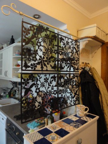 Като продължение на шкафа и поради липсата на досадно антре в апартамента решихме да разделим все пак малко визуално помещенията. Ето защо измислихме нещо, което беше направено пак с подръчни средства - хартисали релса за перде и елементи от декоративна верига за лампа и декоративни пана, купени от Джъмбо за 9 лева.