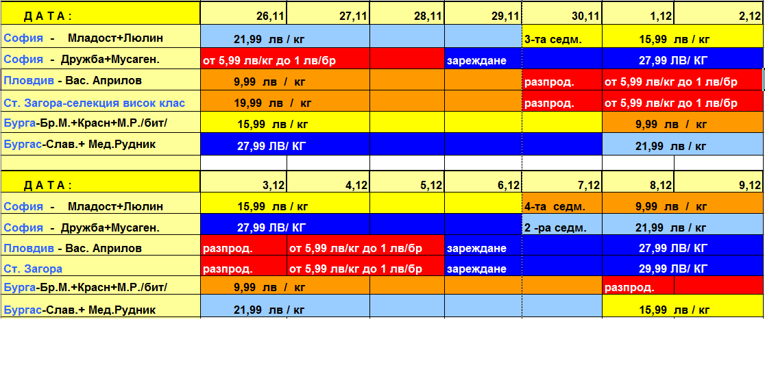 В ЗЗ цените падат всяка седмица (събота) - 27.99 лв/кг - на зареждане, после става 21.99, след това вървят- 15.99, 9.99, 5.99 и в дните преди зареждане е 2.99кг или 1.00лв/бр и 0,50 лв/бр