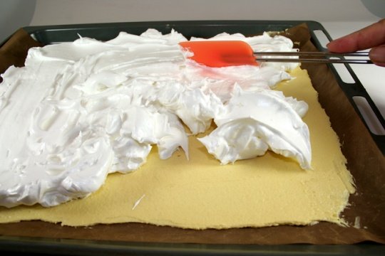 Разбиваш белтъците на пяна, добавяш постепенно захарта и разстилаш готовия маренгс върху първото тесто.