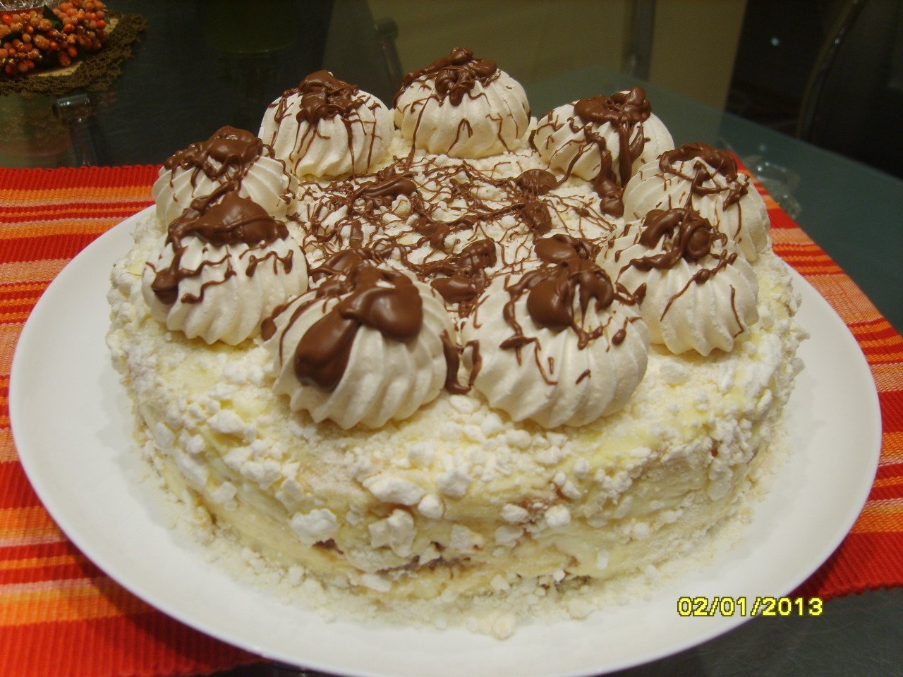 Тортата е с бишкоти и крем от маскарпоне,заквасена сметана и целувки.