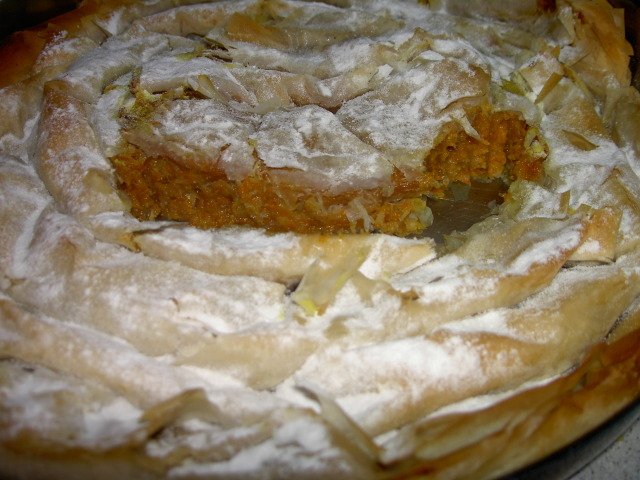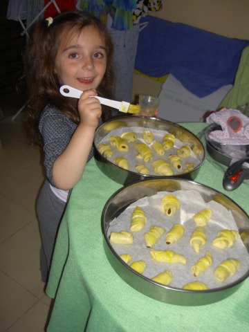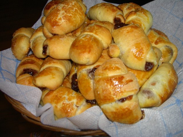 * Оформя се в съда за печене, намазва с разбито яйце с мляко и се посипва с кристална захар;