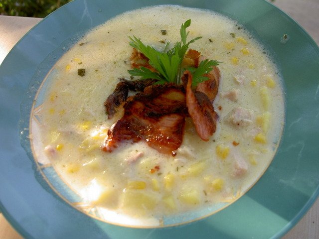 страхотна крем супа с картофи,бекон,сладка царевица и мляко