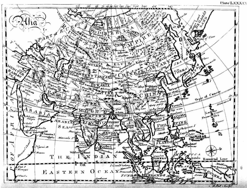 «TARTARY, a vast country in the northern parts of Asia, bounded by Siberia on the north and west: this is called Great Tartary. The Tartars who lie south of Muscovy and Siberia, are those of Astracan, Circassia, and Dagistan, situated north-west of the Caspian-sea; the Calmuc Tartars, who lie between Siberia and the Caspian-sea; the Usbec Tartars and Moguls, who lie north of Persia and India; and lastly, those of Tibet, who lie north-west of China».