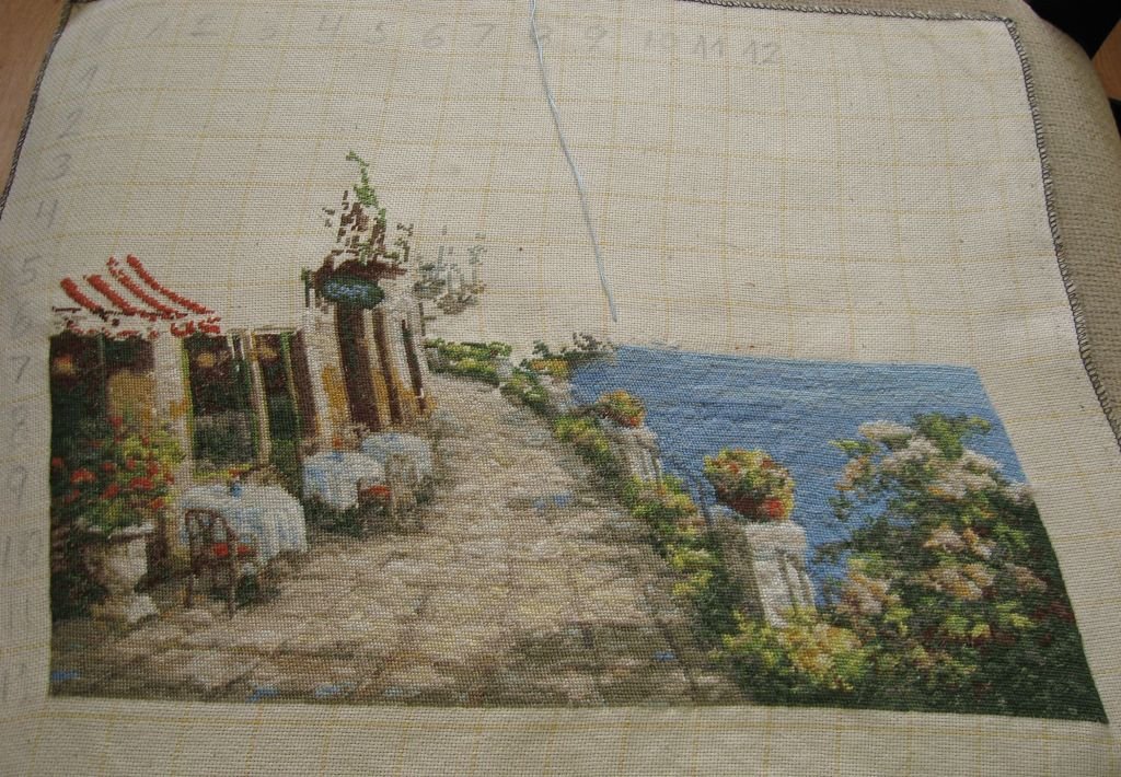 Деси,винаги започвам от левия долен ъгъл и карам по схеми.Т.е би трябвало да ушия целия долен ред схеми,след това целия среден и накрая горния. Но сега , понеже една приятелка искаше да види как става воденицата, за да реши дали да го започва и тя, го подкарах по- нагоре и надясно, за да ушия самата воденица. Сега шия 3-та схема от средата ( от файла в РМ сама си ги разделих на 18 схеми), после ще се върна на 1-ва средна схема, за да се оформи цял ушит участък. На снимката са ушити 2 от 6 долни схени и 2-ра средна.