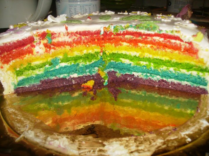 Напълно съм съгласна с теб,  а рецептата е точно такава, каквато предполагаш (маслени блатове и леко лигав крем, поне докато не е стегнал) ето я - http://sunshineskitchen.com/coconut-rainbow-cake/ ама ще ми е обеца на ухото вече - току що получих снимките от тортата отвътре