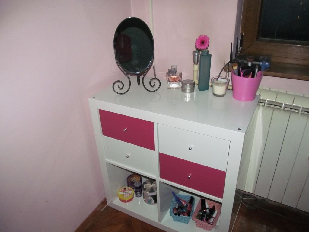 Здравейте, красавици! Simple Smile Понеже някои от вас ми помогнаха в избирането на тоалетка, реших да я снимам и да ви я покажа. Всъщност това е етажерка, която се пълни с шкафове:) Купих я от Икеа, при това на добра цена и реших, че мога да дам идея на някоя от вас, ако в момента се чуди как да организира гримовете си Simple Smile