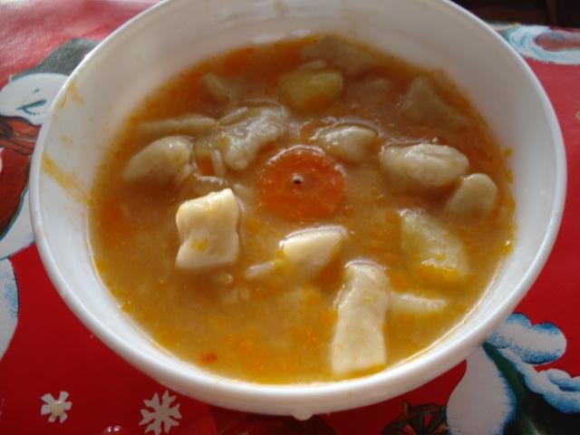Галушки: в съдче слагам чаена чаша брашно, правя кратерче и наливам едва топла подсолена вода и забърквам тестото, после го правя на саламче и го нарязвам и пускам в супата - ври още 10 мин или до готовност на ориза, защото за тестото е достатъчно 5-7 минути.