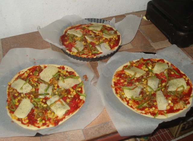 Замесва се тесто /маята се разтваря в хладкото млякото + много малка щипка захар, яйцата се разбиват и всичко се омесва до меко тесто/. Откъсва се топка колкото юмрук, ръцете се намазват с олио, разтегля се до някъде, поставя се в намазнена тава и се раздърпва до краищата. Пицата се намазва с доматен сок, после кашкавал и после всичко останало. Пече се на силна фурна 250-300'С за 10 мин.