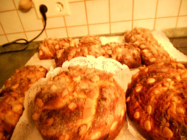 След малко приключвам с последната доза козунак. Измесих 2,5 кг. Уморих се. Кога то измесвах усещах как по гърба ми минава една струйка и се стича чак до бикините ми. В косата бях мокра, но удоволствието ми е голямо. Някаква приятна тръпка усещам при докосването на това тъй мекичко тесто, ухаещо на куп есенции. Ще ги снимам и ще ви ги покажа, след има-няма един час.