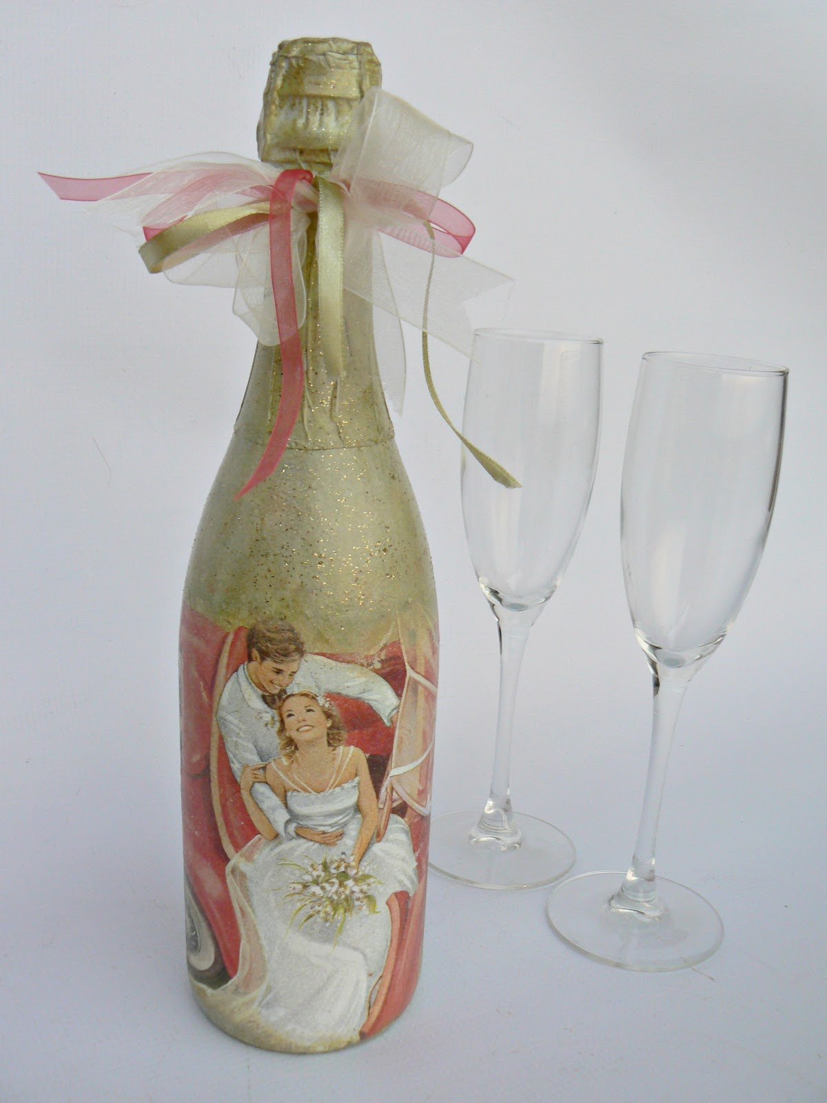 mimenceee такава бутилка можеш и ти да направиш ,пробвай и ще ти хареса.Специално тази картинка е салфетка която аз не съм виждала тук а по руските сайтове,но можеш да направиш и с други картинки ,аз имам два вида салфетки подходящи за сватбена бутилка и ако искаш пусни адреса си на лични за да ти изпратя ,едната съм използвала в розовата чиния - в албума ми е преди този последния комплект като съм изрязала сърцето и вътре вложих снимка на младоженците ,но ти може да измислиш и друго.Питай каквото те интересува ,тук всички момичета са големи сладурани и никой няма д ти откаже помощ