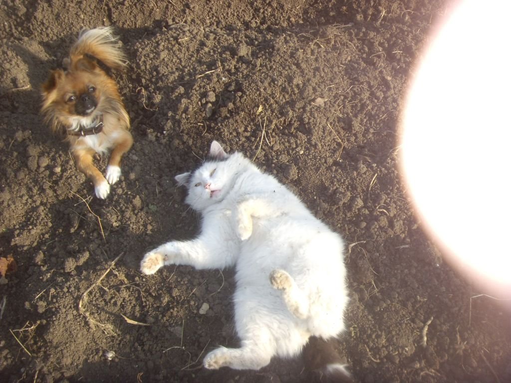е, понякога при игрите си посмачкват нещо, но чужди животни не влизат... А ако са достатъчно смели "гостите" да проверят обстановката, нашите бягат към гончетата по края на двора и...