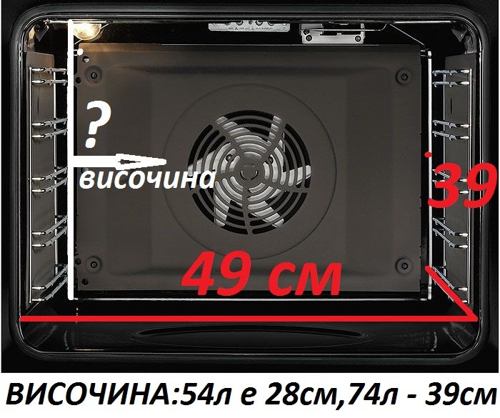 Не е само височината. Касаят и широчината и дълбочината, на което всъщонст много държа, т.е. тавата на фурната да е с голяма площ. Ако се пече гювеч или подобно обемно нещо също е добре да е далеч от реотаните. Затова си я взех 74л. на места я пишат 72л. Електролукс.