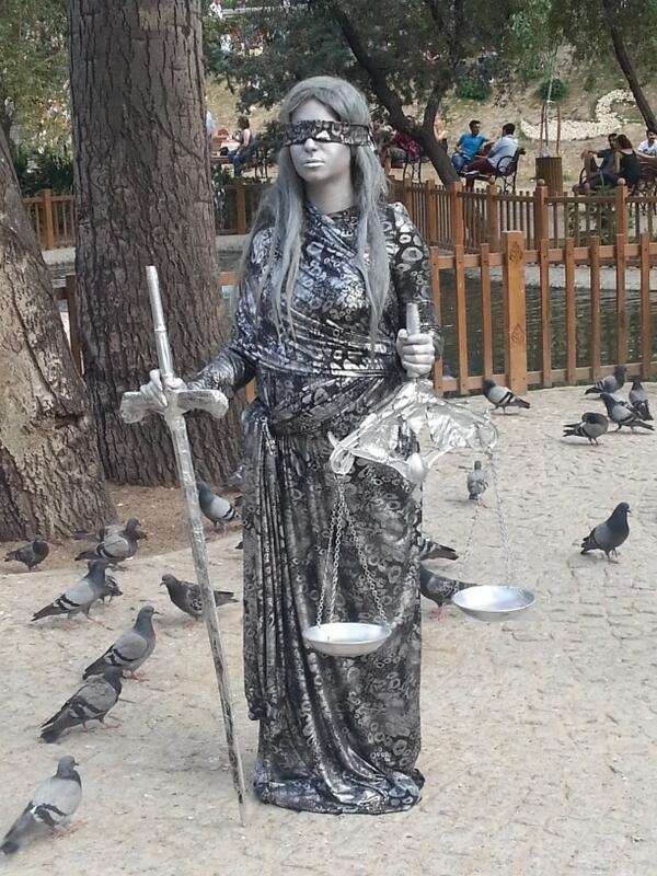 A woman dressed as Justitia stands in Gezi Park as the police officer who has shot and killed Ethem Sarisuluk is released from jail.