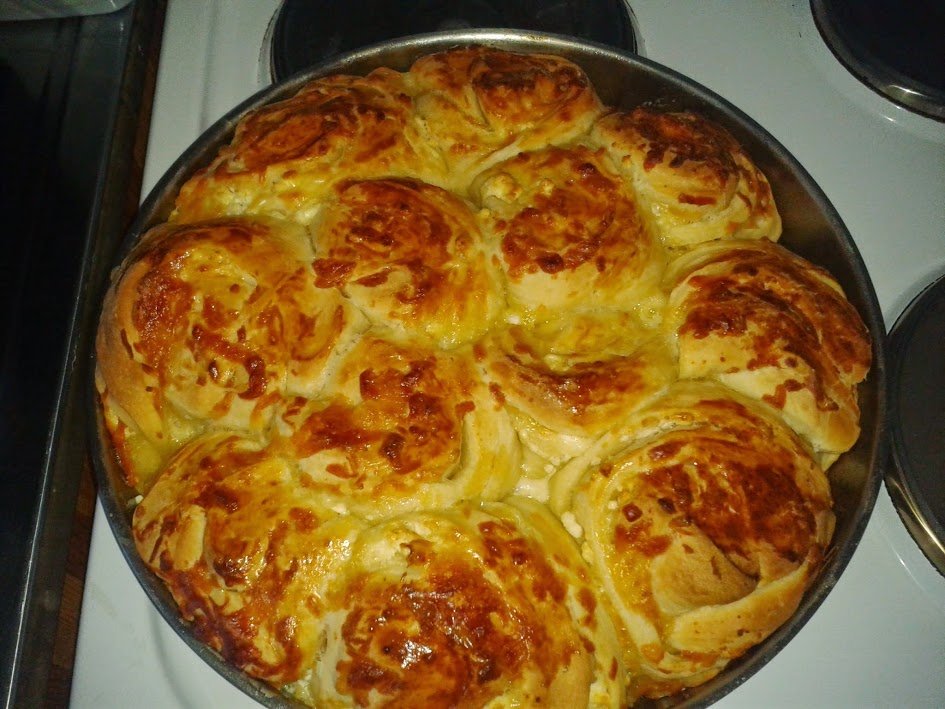 После оформих според рецептата - тестото се разделя на 3 равни части, всяка от които се разточва и се слагат една върху друга, като между тях се поръсва разтопено масло (аз добавих и сирене и кашкавал). После се нарязва на триъгълници, които се навиват, реди се в тава, маже се с жълтък и се пече ( на 200 градуса, до готовност).