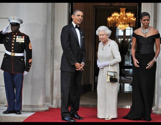 Кралицата някак смаляваща ми се вижда.Явно е по-дребна жена,на фона на семейство Обама е мъничка.