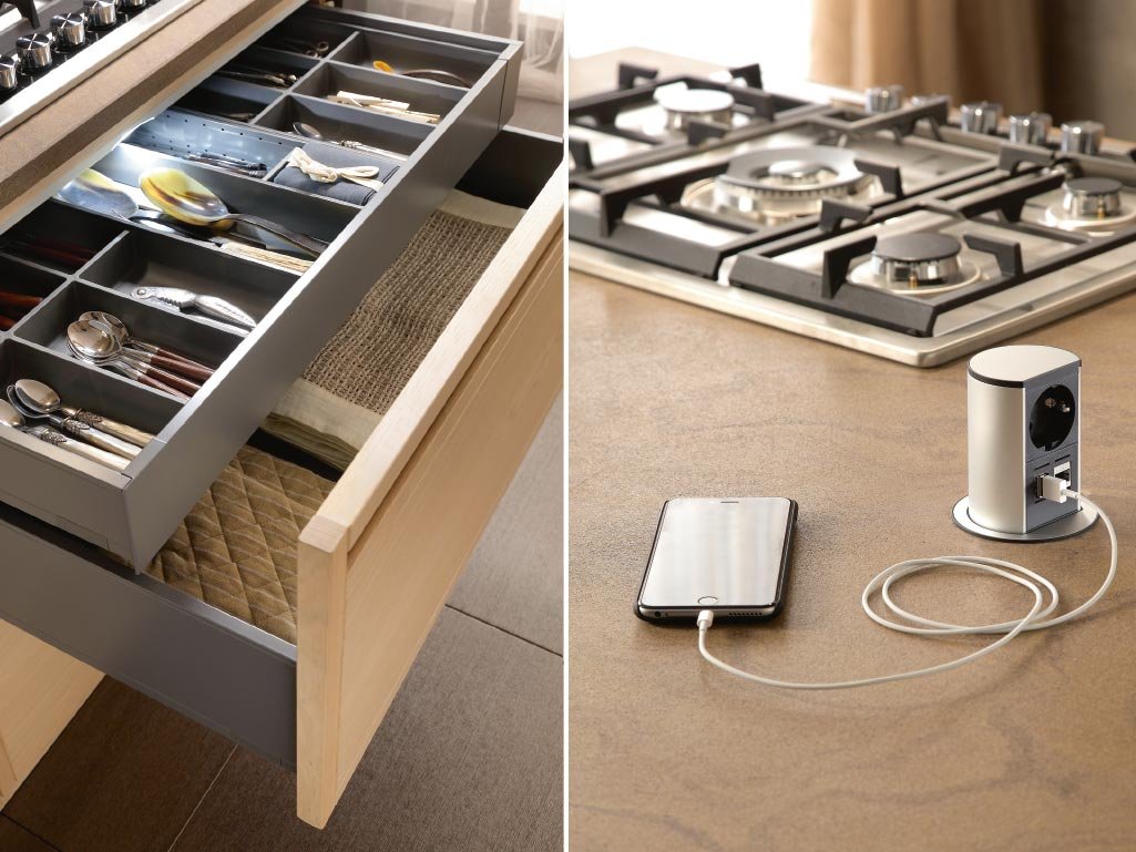 В кухнята могат да се използват различни видове осветление. Някои предпочитат LED ленти под шкафовете за удобство и функционалност. Горната част на шкафа може да има светлини, които не са насочени към очите, осигурявайки мека, студено бяла светлина. За осветление над кухненския плот могат да се използват висящи осветителни тела като "гъба". При ниски тавани може да се използва плафон. Важно е осветлението да е както функционално, така и създаващо уютна атмосфера.