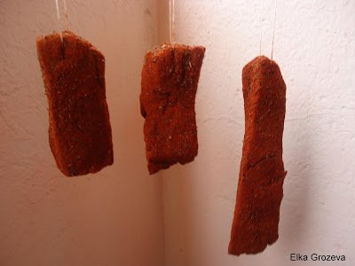 За домашните луканки, пьк като си спомня колко вкусни правеше дядо ми... ех... нищо общо нямаха сьс сегашните произведения, продавани под наименованието "луканка". Рецептата на Вив заслужава да се пробва, само май ще трябва да слагам месото в хладилник, че тук през зимата температурите хич не са ниски. По сходен начин тук приготвят едно сушено телешко месо - biltong- което е страхотно вкусно и е единственото обработено месо, което купуваме.