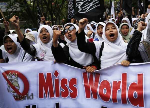 В Индонезия, мюсюлманки протестират срещу провеждането на конкурса там.