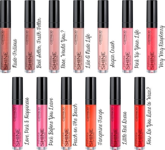 Този гланц на Catrice, вторият от ляво на дясно горе (не особено траен, но с приятен аромат и текстура, много естествен цвят, слабо пигментиран)