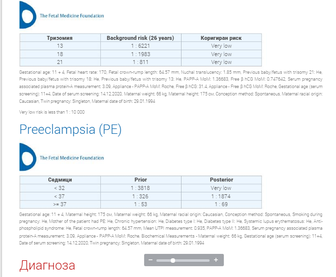 Интересувам се Вие на коя фирма се спряхте и на кой пакет? Бях на БХС в 12г.с. и това са резултатите от тогава. За съжаление беше малко преди празниците, а повечето фирми, които гледахме за пренатални тестове, пишеше, че на 17.12. им е последното пробовземане, а тогава още нямах резултатите. Сега съм 15г.с., на 14.01. има преглед при АГ-то като вече мисля и да насоча освен Фетална морфология при нея, така и при друг специалист (за по-голяма сигурност). Въпросът ми е дали да изчакам още 10 дни, за да стана точно 17г.с. и да видим какво ще види и тогава АГ-то или направо да се насочвам към Пренатален тест? Също така видях, че при някой изледвания излиза само позитивен или отрицателен за някой синдром, докато други (ако не се лъжа Veracity) казват и точността, което повече би ми дало някакво спокойствие сякаш. Спрели сме се на варианта за синдром на Даун, Едуардс и Патау, но още не сме решили коя лаборатория да изберем. На Veracity имат на добра цена пак 870лв. (VERACITY™ Тризомии на 13, 18 и 21 хромозоми, идентификация на Y хромозома, анеуплоидии на X, Y хромозоми), но пък от прочетеното не виждам да има бъдещи мами, които да се доверили на него. Тотално съм се ошашкала и не знам нито към коя фирма да се насоча, нито дали си струва да чакам още 9 дни за прегледа и тогава да го направя или направо още утре да се ориентирам към пренатален тест!