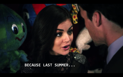 Ария тръгна да му казва "Защото миналото лято...", но се спря когато видя Хана и Спенсър.