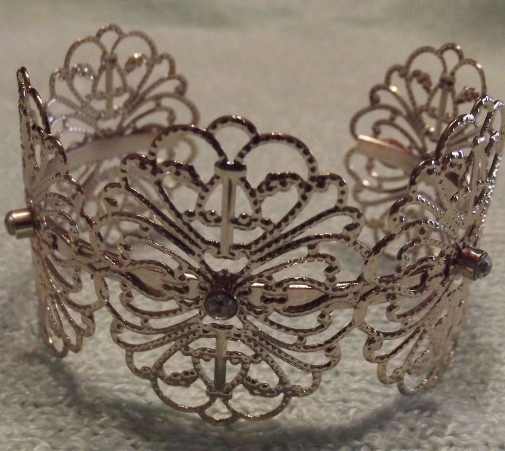Гривната е елипсовидна - 5/6 см диаметър, ширина - 4 см. На изкуствена светлина не мога да уловя истинският и цвят, наподобява злато.