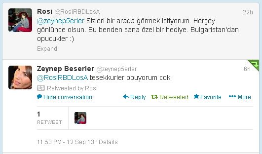 Много ви благодаря! И аз се надявам Зейнеп да покани хората от екипа ...  Two Hearts  love001 Two Hearts Колкото до това, че не е отговорила на въпроса ми за Берк и Чаала - това няма значение. Аз пратих 2 съобщения едно подир друго и тя е отговорила след второто. Важното е, че ги е прочела и знае, че много искам да ги видя там.  txtloves txtloves txtloves Пък и няма как да ми каже просто така.  Wink Надявам се да ни изненада и да видим Берк и Чаала, както и останалите там ...  Praynig   Kissing Heart Two Hearts