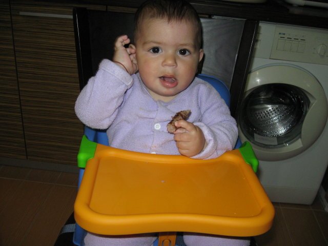 . Избиха му и горните резци. Станаха 5. Днес му дадох пюре от пуешко на лъжица и му я пълнех - той смучеше. Мазах и в/у краставица..